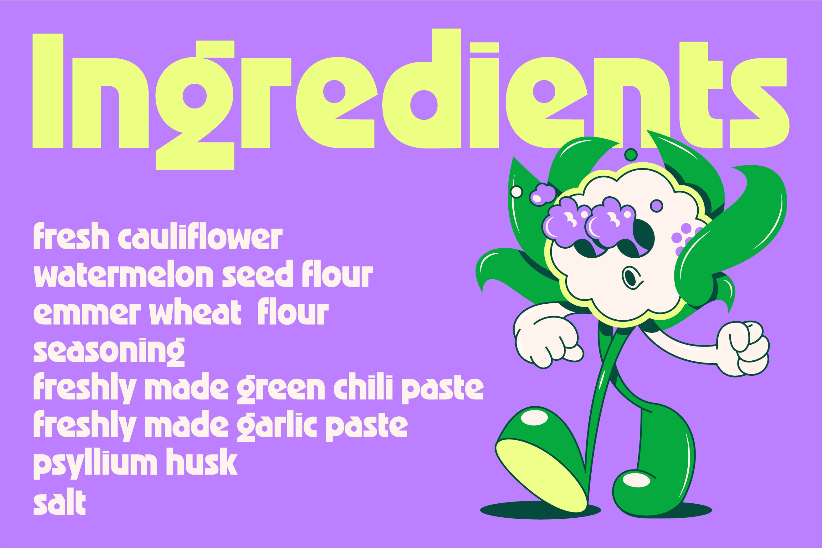 A memorable logo featuring a stylized cauliflower character set an engaging tone, highlighting the snack’s playful personality while subtly nodding to its health-driven roots.
